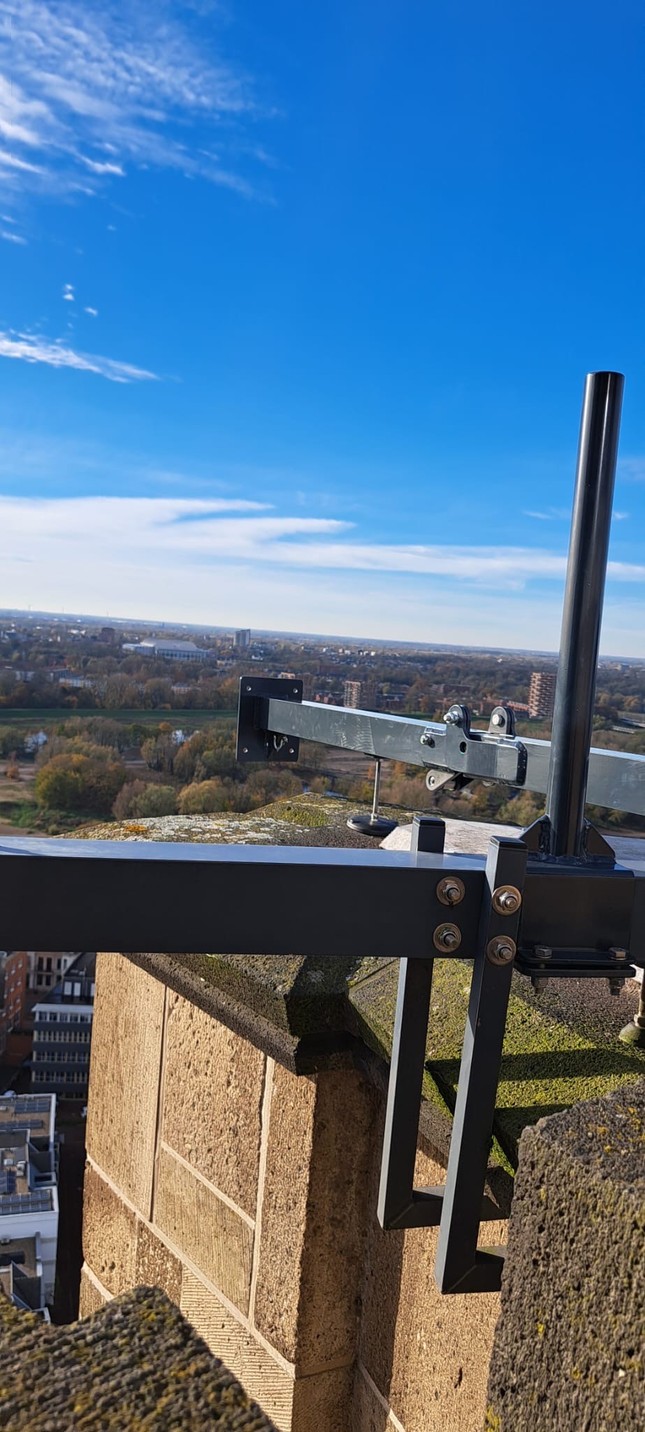 Voor een project aan de Eusebiuskerk hebben wij een specialistische syteem op maat ontworpen en gerealiseerd. Dit systeem dient als bevestigingssysteem voor een camera-drone en is op grote hoogte aan de kerk geplaatst.